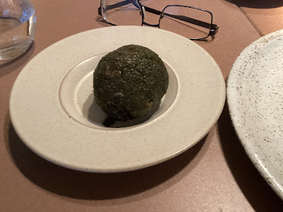 And so our gastronomic perambulation began. We started off at Gulp itself where the pink logo served as inspiration for a delightful savoury meringue of beetroot and goats cheese - classic ingredient combinations but totally delightful. Light as a whisper - and there it was gone - and we set off for Key Hill where the cemetery was the inspiration for the next course (how often can you say that?). There was a combined plate of Headstone - a cracker with labneh and luscious sweet red peppers - and Gravestone - rye bread with a butter bean spread and pickled red onion and the taste of sumac with tasty cemetery soil scattered around, made from olives and bread, with pea shoots giving us the greenery of the cemetery served with a side-plate of Moss (that grows on the stones - a beignet-like sphere, courgette in origin, boosted by the flourish of nori.