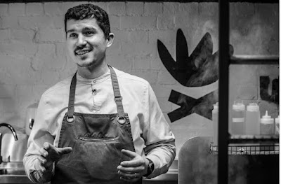 Next an arresting autumnal visual experience - thin slices of Warwickshire Jerusalem artichokes paired with apple - a fine coupling - presented on a bed of dried artichoke stems. Then, a fine wagyu tartar croustade, the meat originating at Dunwood Farm near Stoke on Trent, with black garlic, the sweet tang of pickled elderflower along with peppery nasturtium leaves.